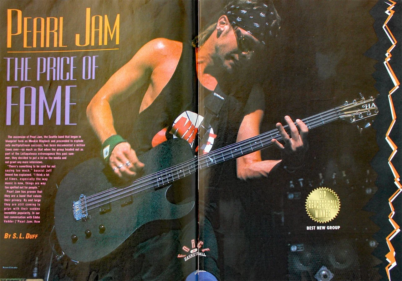 A two-page photo of Pearl Jam’s Jeff Ament includes a Hamer “Ament” 12-string bass.
