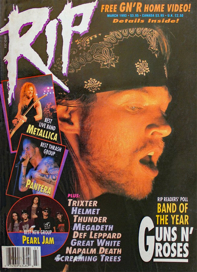 Published between 1986 and 1996, Rip Magazine was focused on hard rock bands. Larry Flynt, founder of magazines such as Hustler, was the publisher.